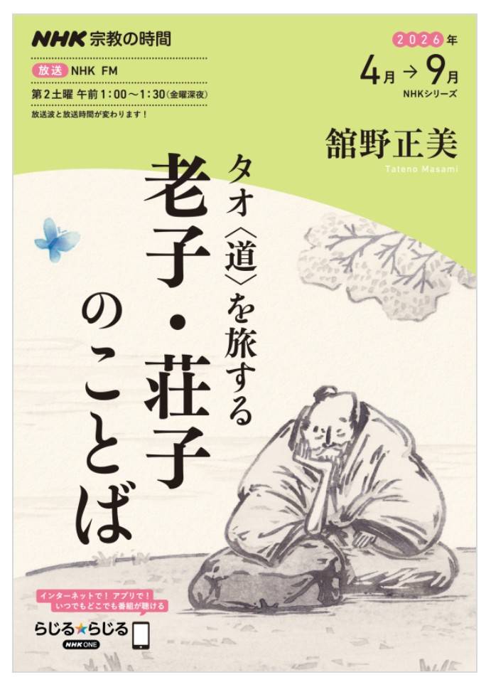2026年4月4日 「NHKラジオ 老荘思想(宗教の時間)に学術顧問が出演」 昭和26年からNHKラジオで放送されている有数の長寿番組「宗教の時間」 令和8年4月〜 占術に深く関係している哲学 「タオ〈道〉を旅する―老子・荘子のことば」が放送されます。 弊組合の学術顧問 舘野正美先生がご出演いたします。 番組ガイドブックとして舘野正美先生執筆 「タオ〈道〉を旅する 老子・荘子のことば」(NHKシリーズ)が全国の書店にて発売中